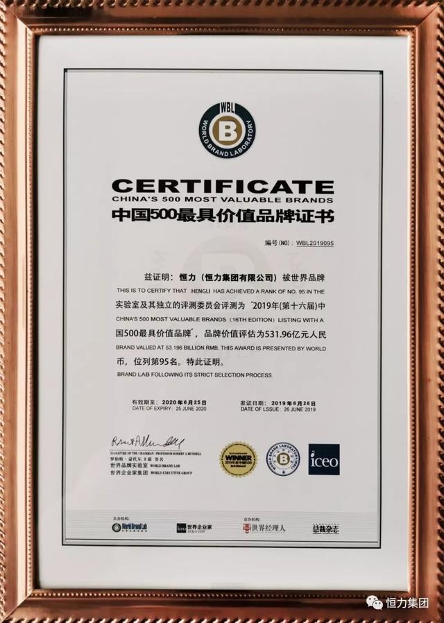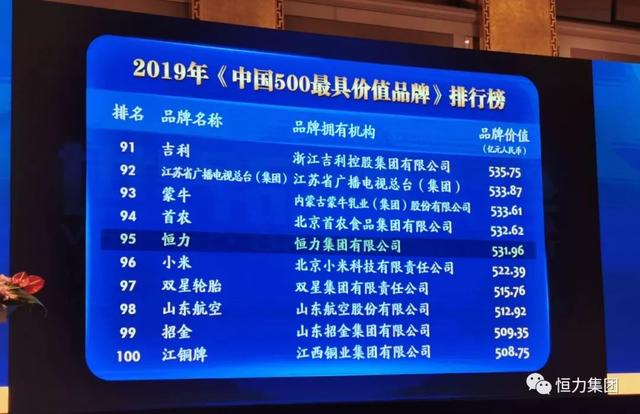 6月26日下午,由世界品牌實驗室(World Brand Lab)主辦的第十六屆“世界品牌大會”在北京舉行。會上發布了2019年《中國500最具價值品牌》分析報告,恒力集團“恒力”品牌再度入圍2019年“中國500最具價值品牌”,以531.96億元位列第95位。