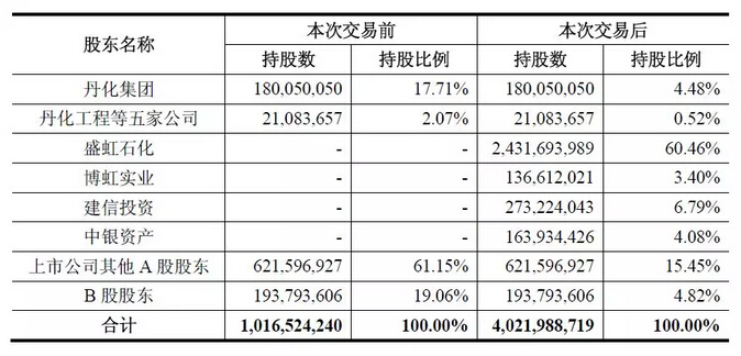 丹化科技此次擬向斯爾邦全體股東發行股份30.05億股,其中向盛虹石化發行24.32億股、向博虹實業發行1.37股、向建信投資發行2.73億股、向中銀資產發行1.64億股。