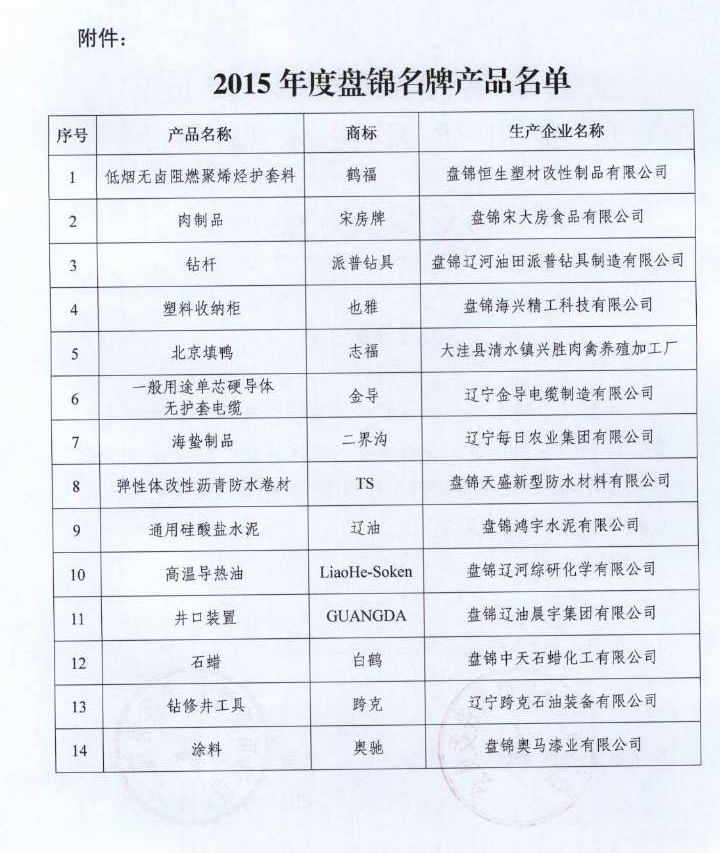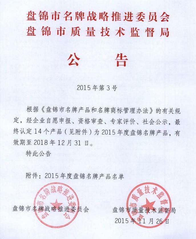 我公司產品——鶴福牌低煙無鹵阻燃聚烯烴護套料,通過盤錦市名牌戰略推進委員會、盤錦市質量技術監督局評價審核,被認定為2015年度盤錦名牌產品!