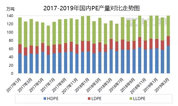 2019年一季度國內PE產量約432.64萬噸,較去年同期增加7.74%。其中,LDPE較去年同期減少2.63%,低壓較去年同期增加19.23%,線性較去年同期增加1.77%。