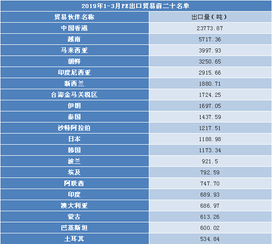 根據海關統計數據顯示,一季度PE市場出口量呈現較大幅度的增長,2019年1-3月PE共計出口6.29萬噸,比去年同期增長39.16%。出口數據呈現對主要市場貿易對象出口數量普遍增長以及貿易區域集中化程度高兩大特點。