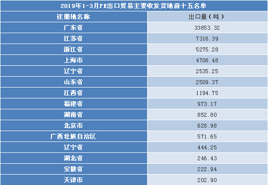從上表可以看出,貿易區域布局集中化程度高。中國PE出口收發貨地主要集中于沿海的廣東省、江蘇省和浙江省。2019年1-3月廣東省、江蘇省、浙江省共計出口4.64萬噸,占出口總量的75.13%。具體到各省份來看,廣東省累計出口3.39萬噸,較去年同期增加45.49%;江蘇省累計出口0.73萬噸,較去年同期增加52.08%;浙江省累計出口0.53噸,較去年同期增加26.19%。